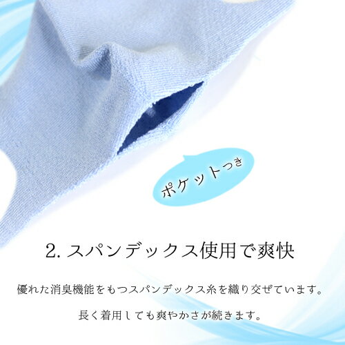 この糸は優れた消臭機能を備え臭いの三大源である アンモニアを96.2%、酢酸ガス99%、イソ吉草酸ガス99%を削減 3.二重編み加工 二重編みになっていて、下側にポケットがあるので、お客様がお持ちのガーゼや抗ウイルスシートなどを挟む事が出来ます。