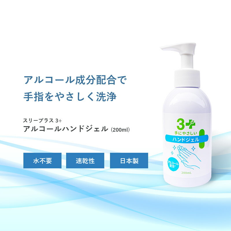 名称 スリープラス 3+ アルコールハンドジェル 素材・成分 エタノール、水、グリセリン、カルボマー、TEA 内容量 200ml 36本セット 7200ml 保存方法 直射日光・高温多湿の場所を避けて保管してください。