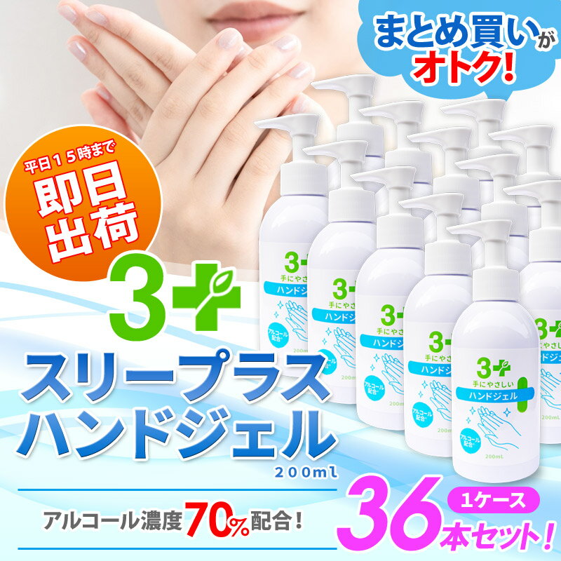 【平日15時、土日祝12時まで即日発送!】 ハンドジェル 200ml 36本組 7200ml 日本製 アルコール 濃度 70% 以上 殺菌 消毒液 除菌 速乾 清潔 ボトルタイプ 大容量 置き型 アルコールジェル エタノール スリープラス (締切時間までに決済確認が取れたご注文分は即日出荷!)